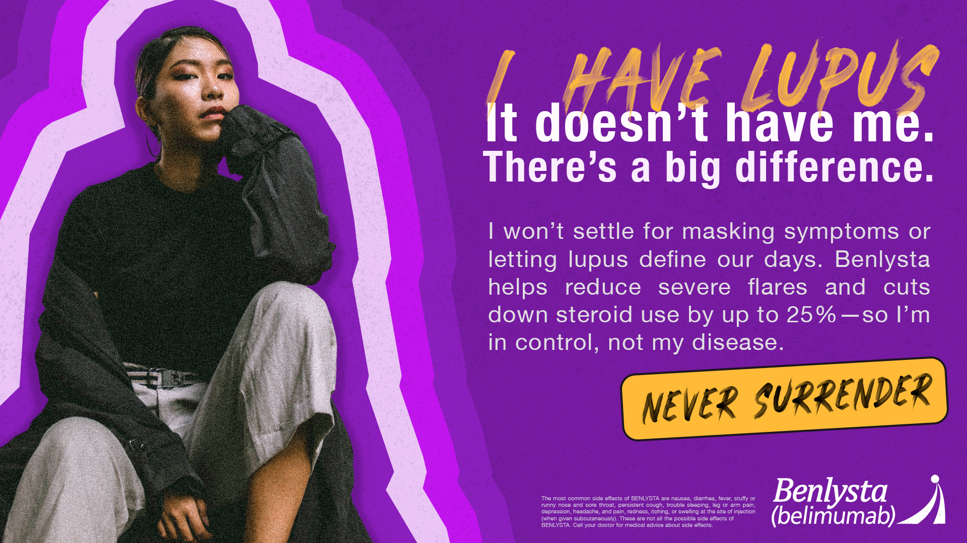 This is your anthem. A playlist built to push you to the front of your own story. The BENLYSTA No Surrender Playlist is packed with the songs to keep you going strong. Because with BENLYSTA, you’re taking back control. Power through. Demand more. And don’t let anything hold you back. NO SURRENDER.